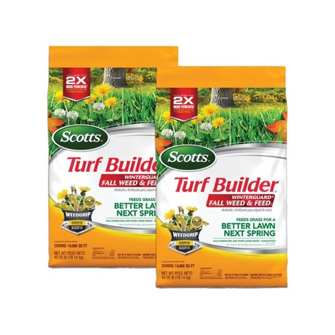 Fall lawn fertilizer plus weed control late fall is the best feeding time for turf late fall is the best feeding time for turf builder winterguard with plus 2 weed control because it builds strong deep roots and prepares grass for winter. Covers up to 15,000 sq. The lawn food is formulated to deliver the nutrients lawns need in the fall to repair damage from the heat, drought and activity of the summer. Fall is the best time to feed, and with scotts turf builder winterguard fall weed & feed3. Not only will it help build strong, deep grass roots for a thicker, better lawn come spring, but it also provides nutrients to help repair damage from summer heat, drought, and activity.